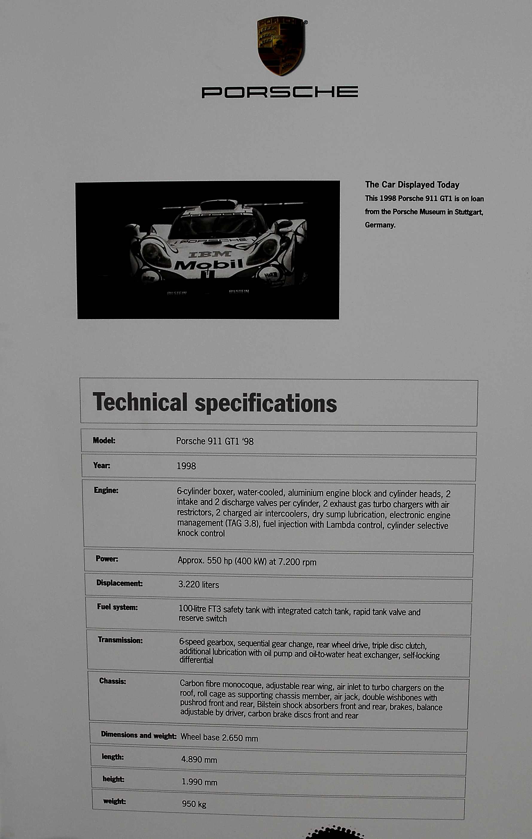 3,163 CC DOHC Flat 6-Cylinder Engine; TAG Electronic Fuel Injection; Twin KKK Turbochargers; Estimated 600 BHP at 7,200 RPM; 6-Speed Manual Gearbox; 4-Wheel Drilled and Ventilated Disc Brakes; 4-Wheel Independent Double Wishbone; Suspension with Adjustable Coil Springs, Shock Absorbers and Stabilizers; Factory Entry at the 1997 24 Hours of Le Mans
